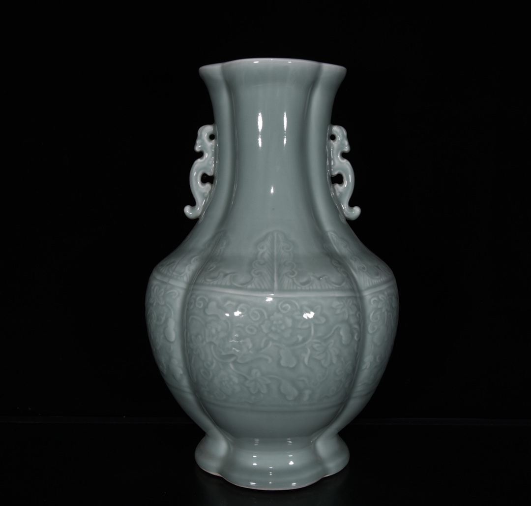 - ◆珍蔵◆中国古美術 大清乾隆年製款 豆青釉 古陶磁 高浮雕 纏枝蓮花紋双耳瓶 精品 細密細工造 置物 擺件 骨董品 古賞物