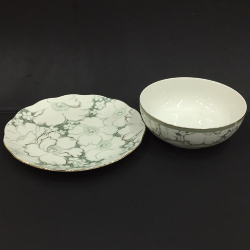 - ナルミ 花柄 サラダボウル 深皿 直径20cm 高さ約7cm 他 プレート 直径26.7cm 含 白×緑系 金彩 食器 計2点 セット