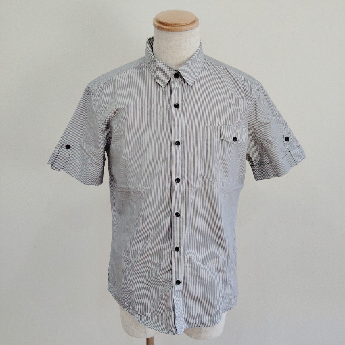 - 198/L/I'm David メンズ シャツ 半袖 ストライプ 替ボタン付 黒