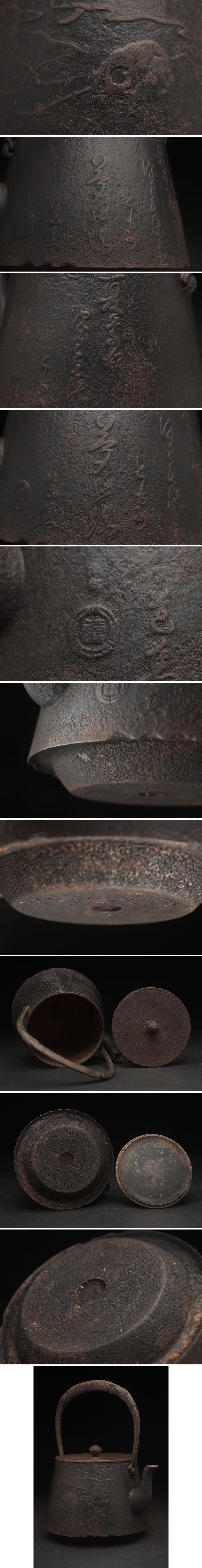 > UU986 時代物 在銘 平打提手 野晒 芭蕉漢詩文 富士形 銀被口 鉄瓶 高23cm 水漏無・鐡瓶・鐵壺 煎茶道具 南部鉄器