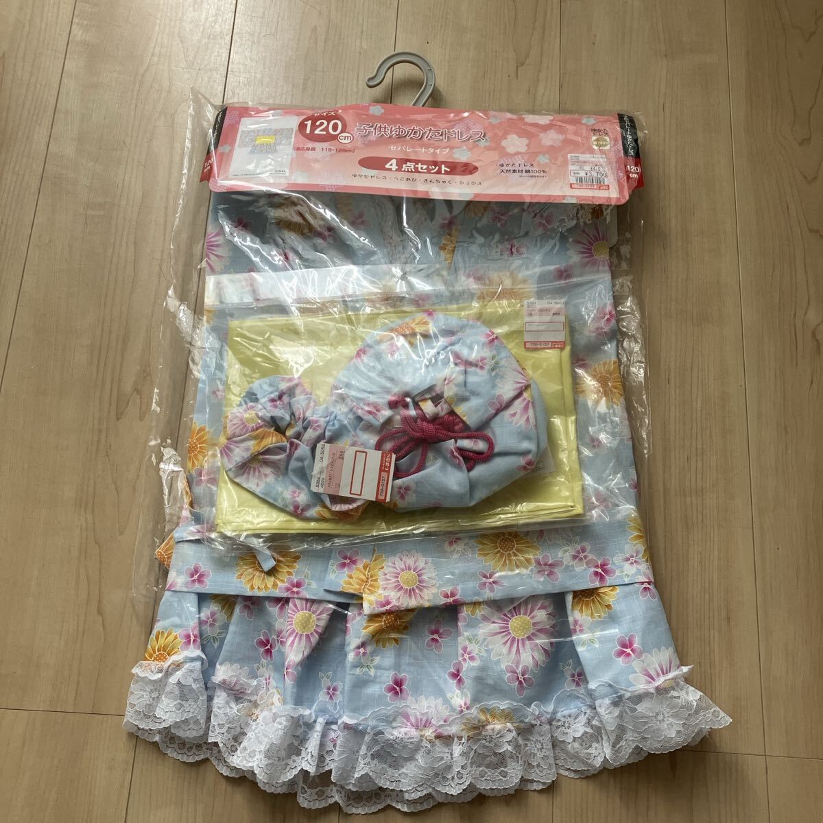 > 新品 未使用 浴衣 浴衣ドレス ゆかたドレス セパレート 4点セット 帯 巾着 シュシュ 水色 花柄 レース 120 120cm しまむら 子供 キッズ