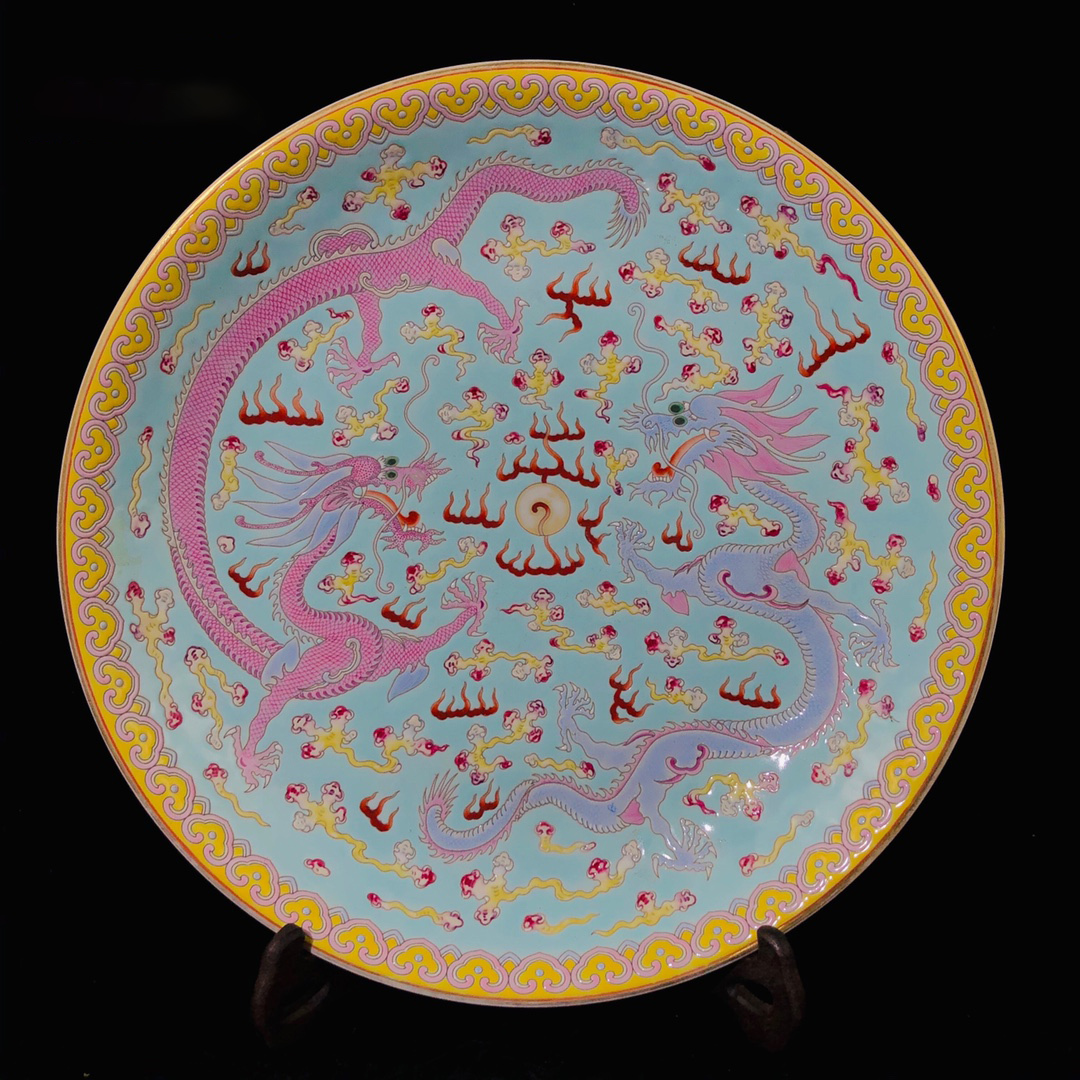 > 9+GV9742「東洋美術」 中国骨董 人間国宝 磁器製品【真珠の皿で遊ぶエナメルの双龍】 旧物 孤品 珍品 陶磁器 収蔵価値が高い