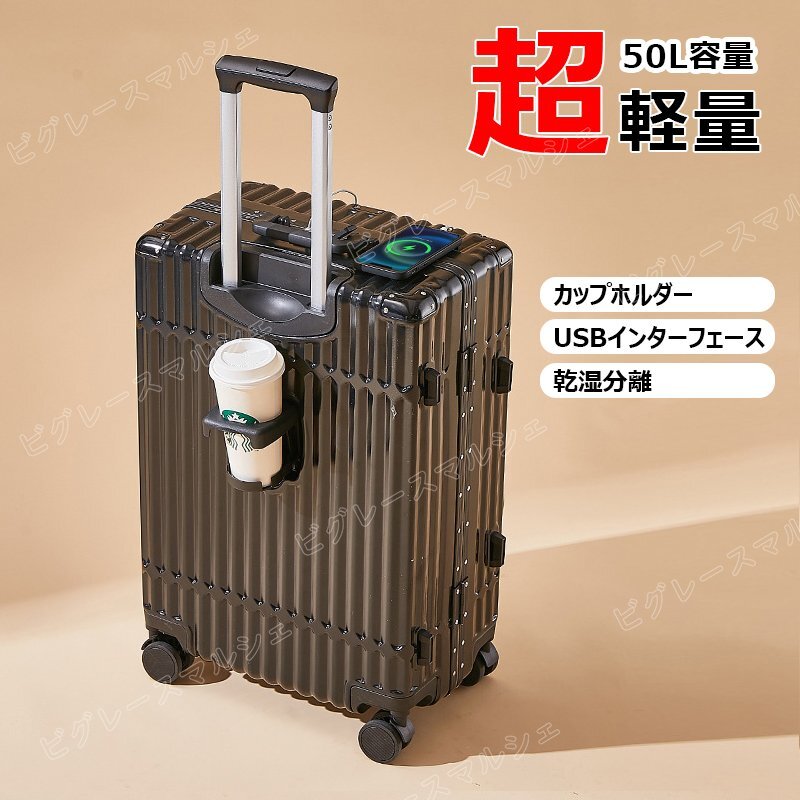 > 22インチの超軽量スーツケース、カップホルダー+USBインターフェース+乾湿分離、アルミフレームトロリースーツケース ムおしゃれかわいい