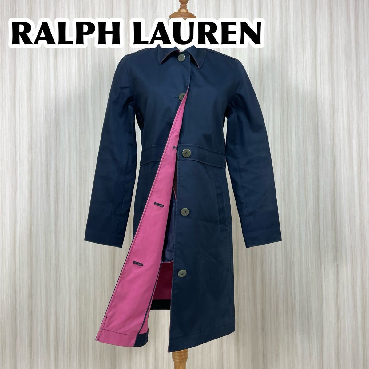 > ☆RALPH LAUREN☆ラルフローレン ステンカラーコート サイズ9 ネイビー 濃紺 レディース M 裏地ピンク ロゴボタン インパクト21 古着