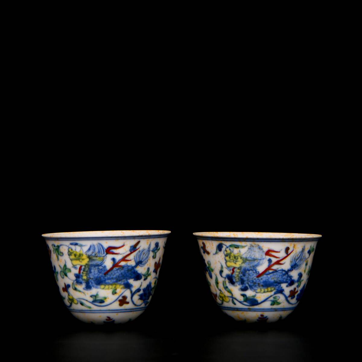 > 9+GV9773「東洋美術」 中国骨董 人間国宝 磁器製品【麒麟文様の赤い胴の斗彩タンブラーカップ2個】 旧物 孤品 珍品 陶磁器 収蔵価値が高い