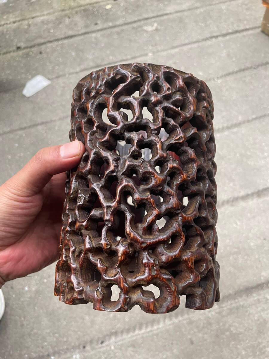 - 蔵友旧蔵出 竹材製 細密彫 鏤空彫 文房筆筒 文房具 供養品 置物擺件 稀少珍藏品 古賞物 中国古玩 中国古美術品