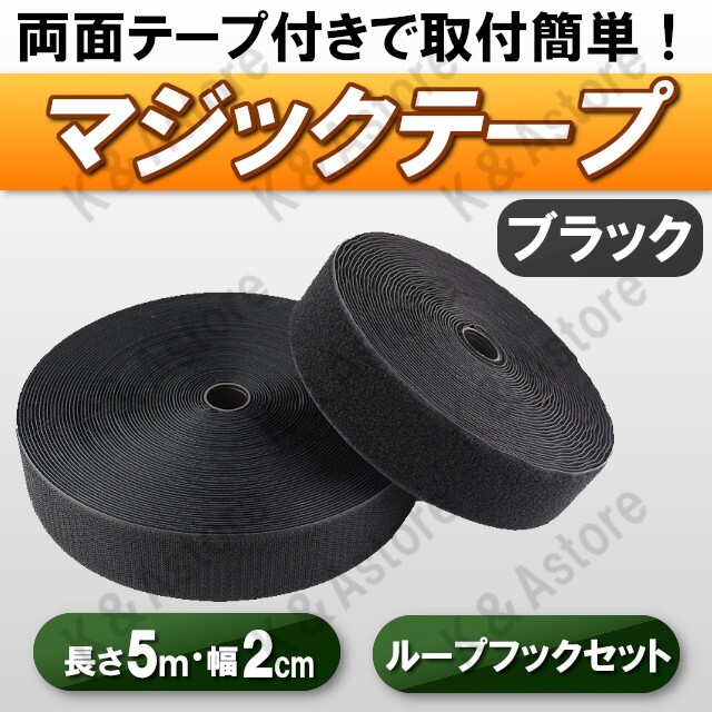 > マジックテープ 強力 粘着 両面テープ付き 面ファスナー 長さ5M 幅2cm 貼付テープ 網戸 工作 ズレ防止 オス メス ブラック