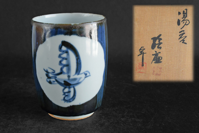 - 人間国宝 加藤卓男 合作 染付 鳥図 湯呑