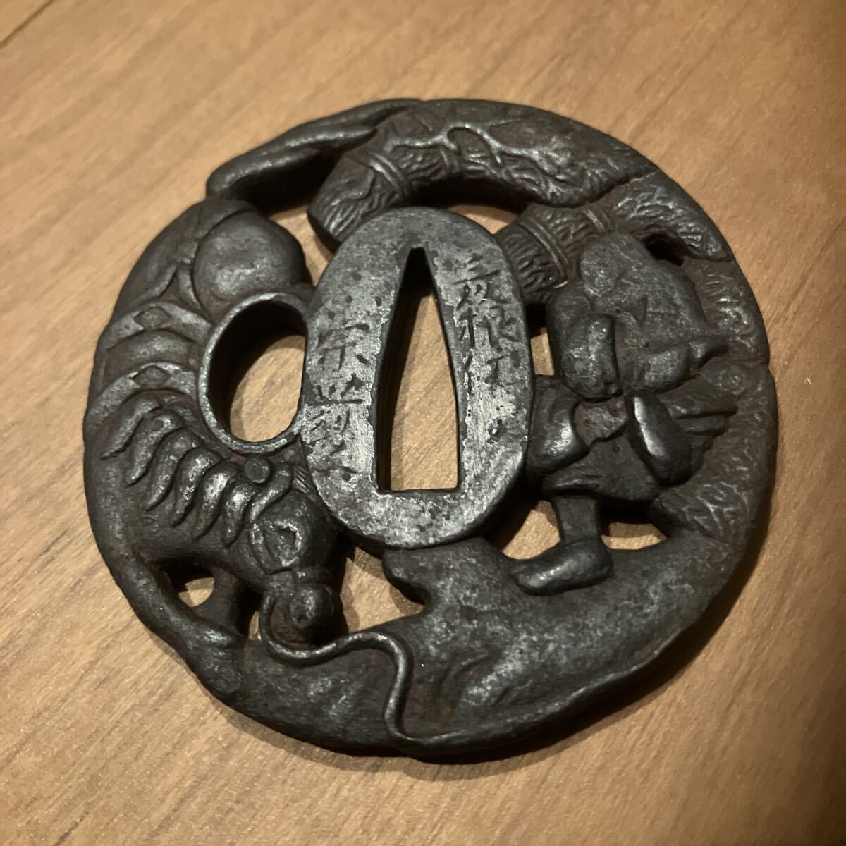> アンティーク 蚤の市 年代物 江戸期 鍔 銘「彦根住宗典」刀装具 日本刀 武具 甲冑 JAPAN サムライ 侍 牛飼図 骨董