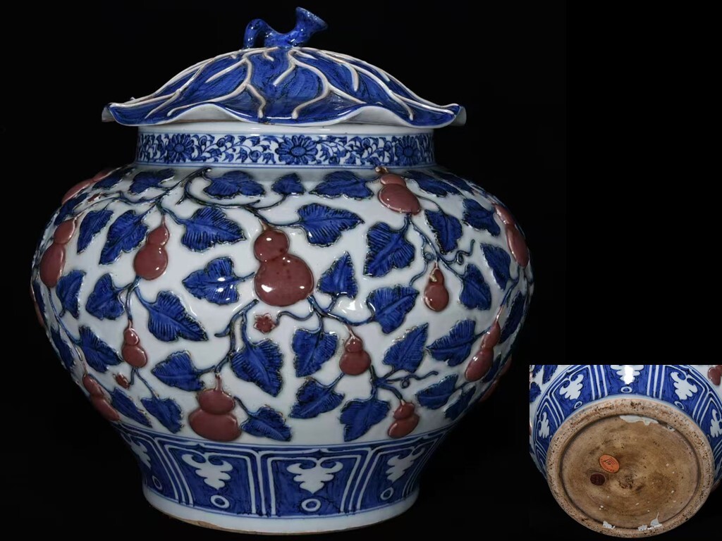 > LM506■古玩 陶芸 磁器『元時代釉里紅浮彫瓢箪紋荷葉蓋壺』古代工芸品 陶芸 精美彫 置物■高さ37cm直径36cm■