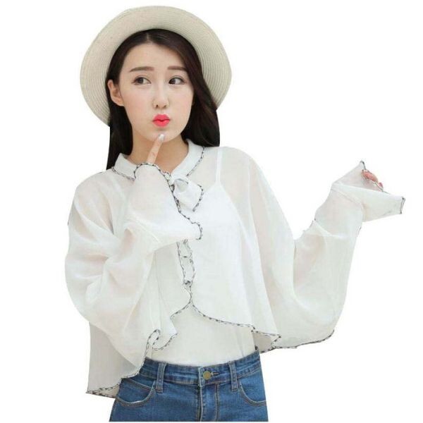 - ボレロ 日焼け防止 シフォン フレアロングスリーブ 前結びリボン レディース ホワイト フリーサイズ 白