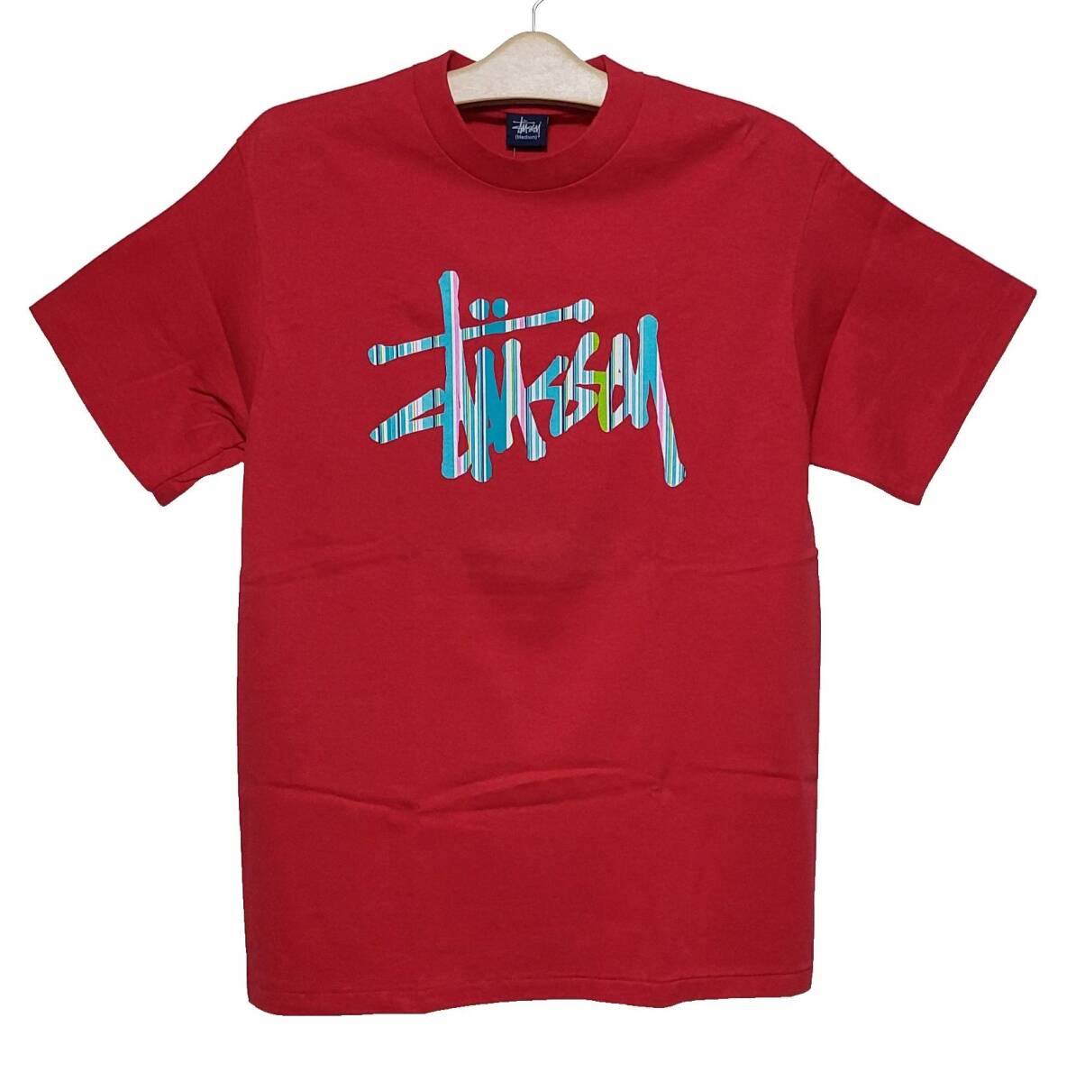 - 激レア超希少!新品タグ付き!STUSSY オールドステューシー 90,s紺タグ ロゴ王冠ストライプ柄プリントTシャツ M 赤レッド デッドストック