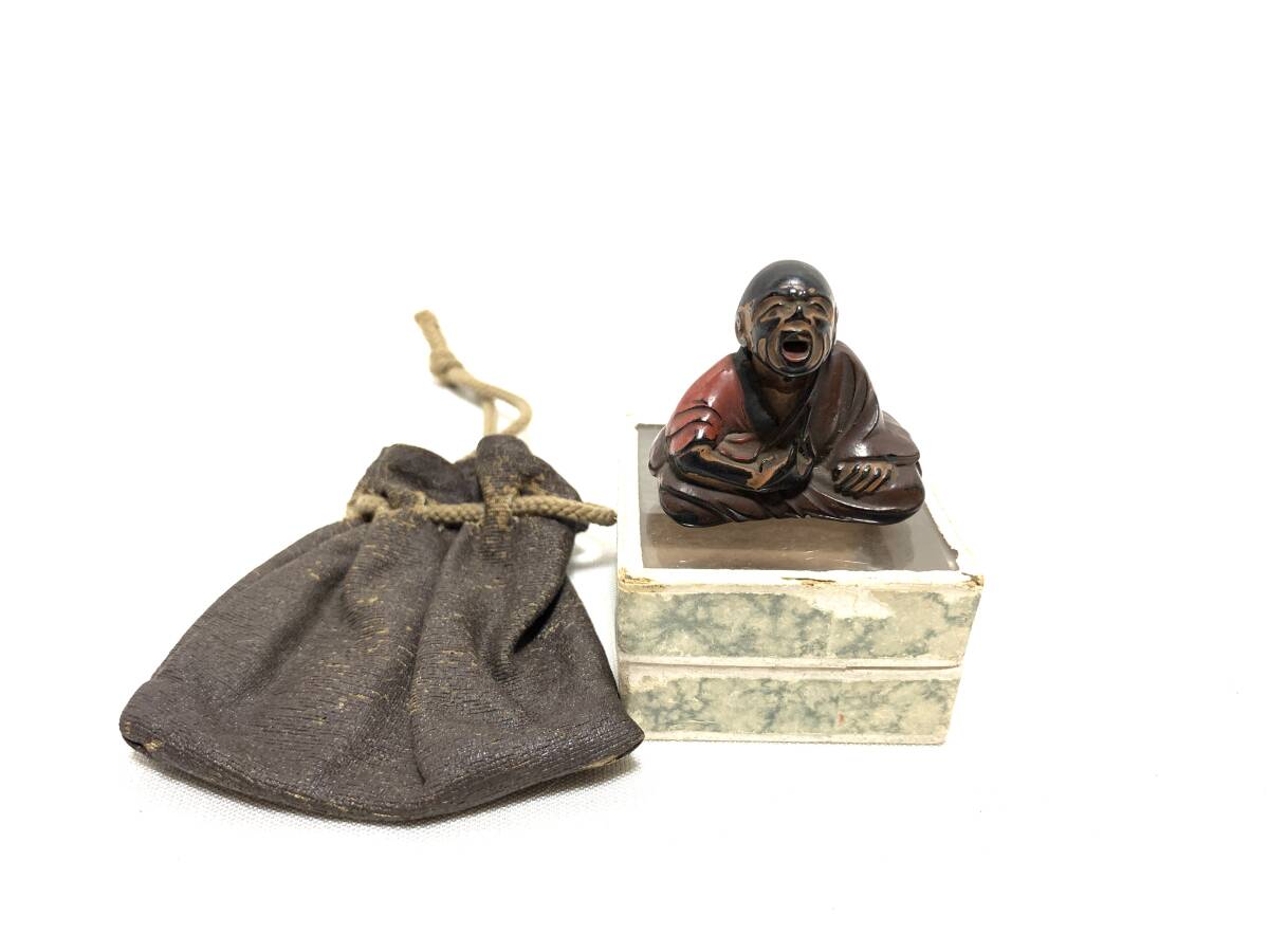 - U668 木彫根来根付 くしゃみ 人物噺家根付 日本 江戸時代 巾着付き 歴史 提げ物 印籠 在銘花押 NETSUKE 蔵出し 在銘有
