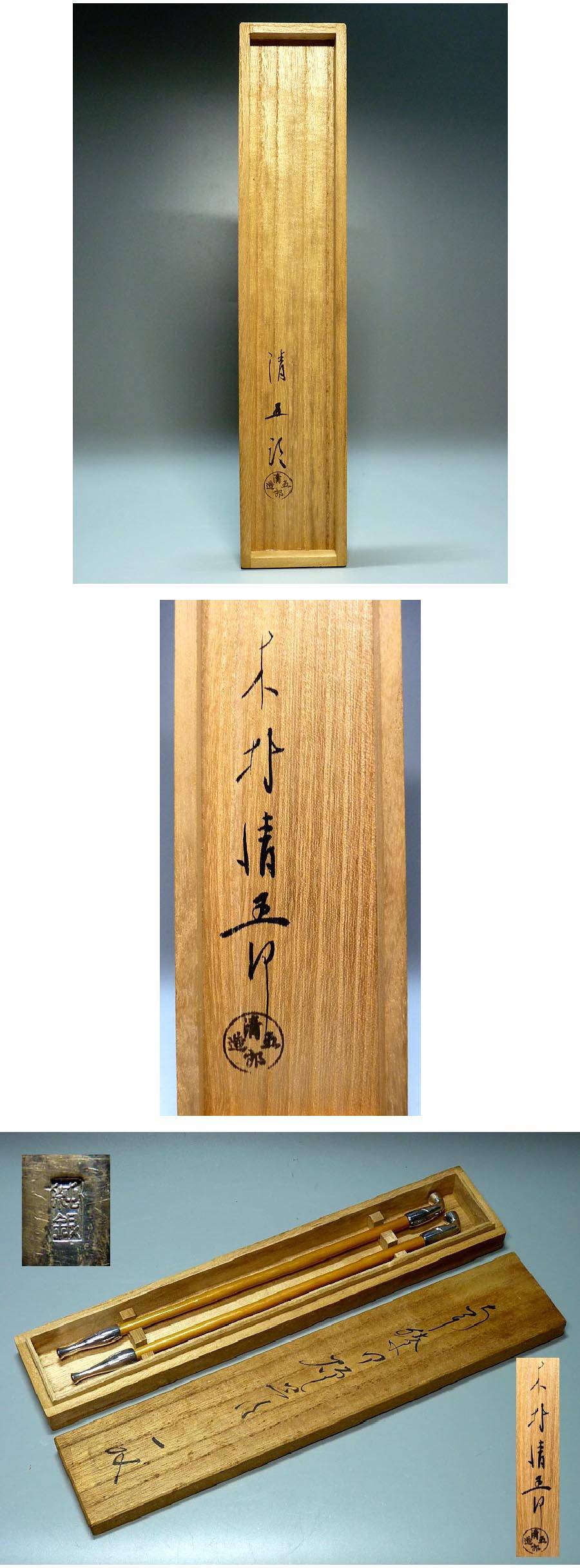 - 【夢たま】茶道具のウブ品!木村清五郎 銀杏彫 南鐐煙管 一双 純銀刻印/共箱 銀細工 キセル 彫金★