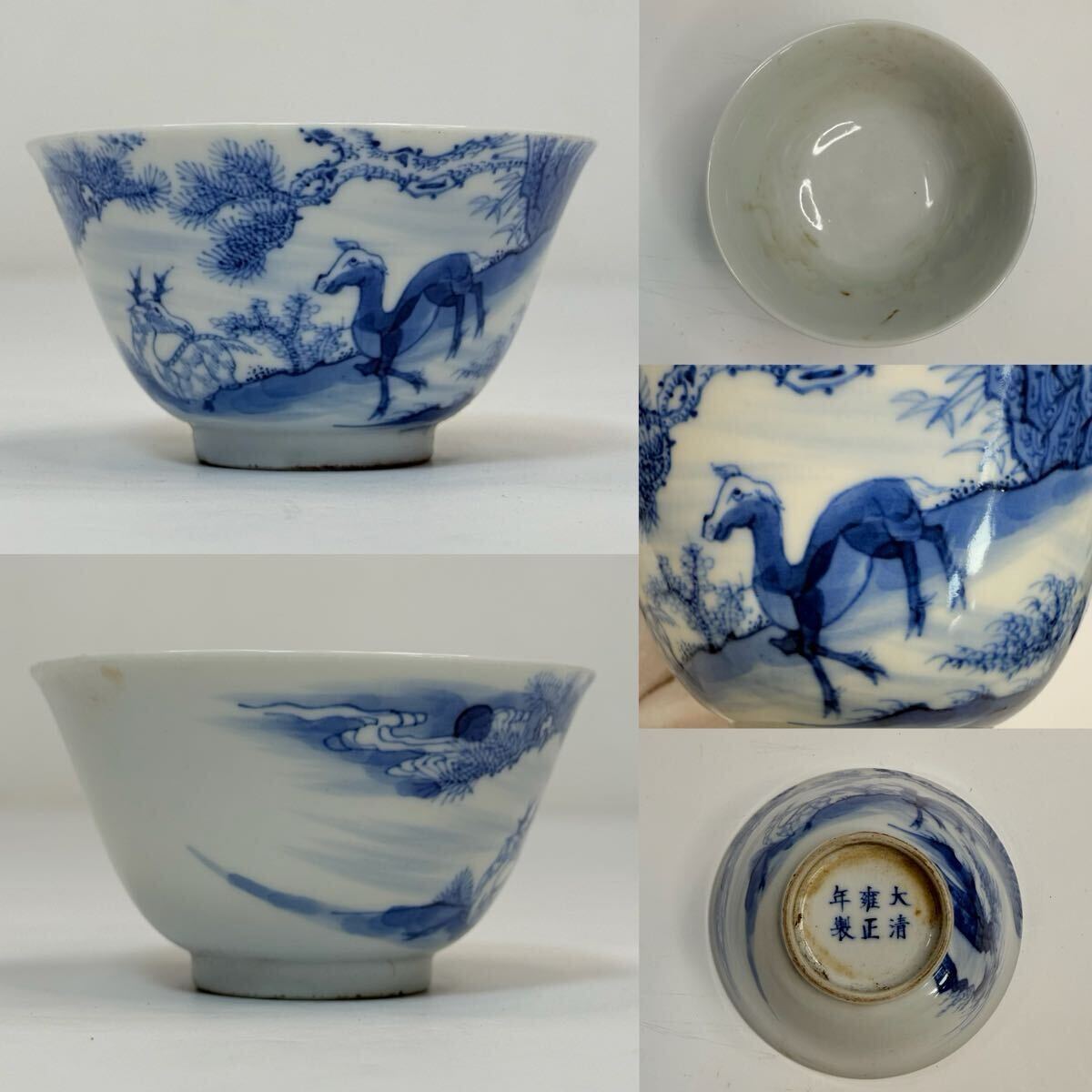 - X-中国古美術 時代物 染付 茶碗 茶道具 煎茶道具 青華 馬図 在銘 大清雍正年製 唐物 陶磁器 中国古玩 骨董品