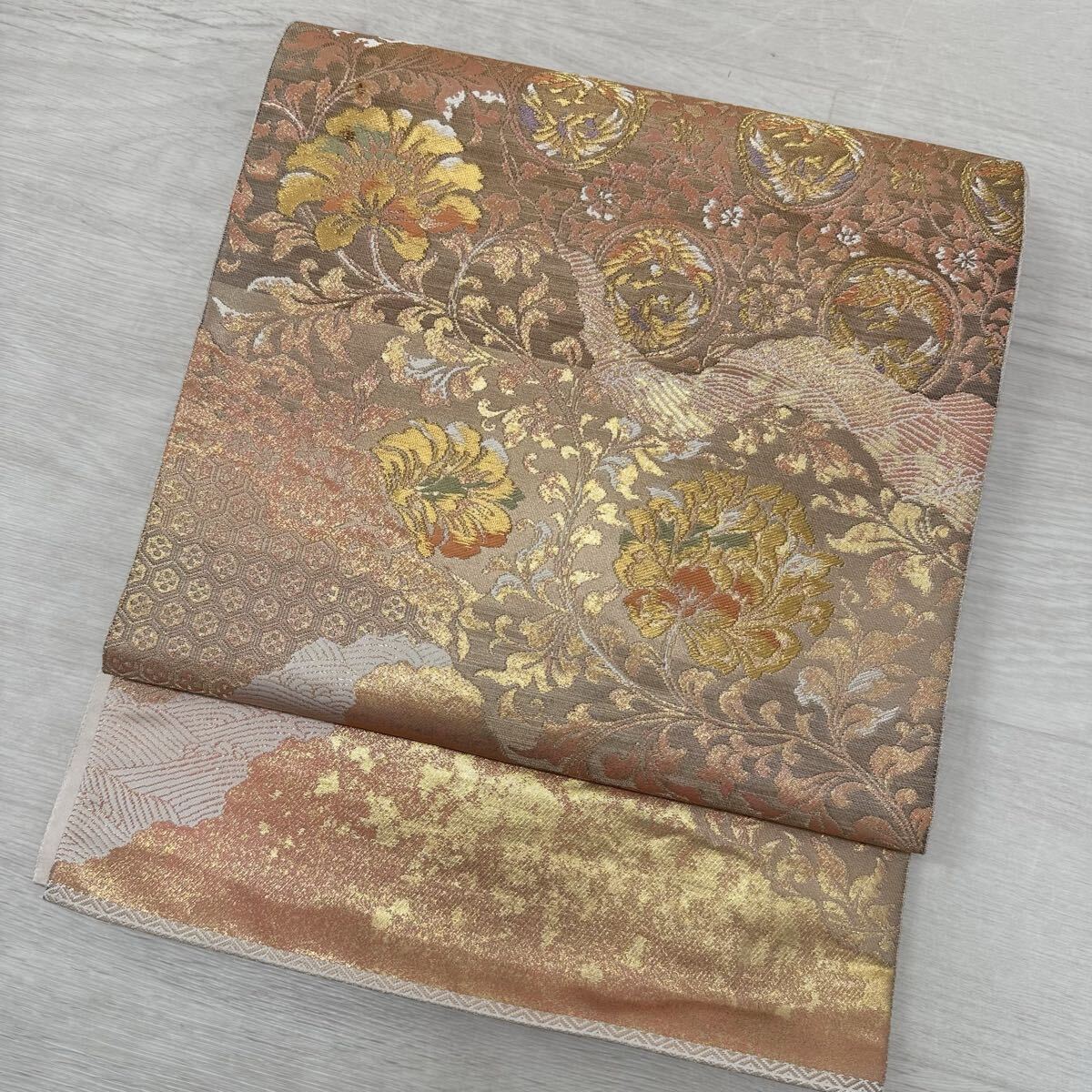 > 服部織物 こはく錦 袋帯 花模様に向かい鳳凰 正絹 着物 W-4450