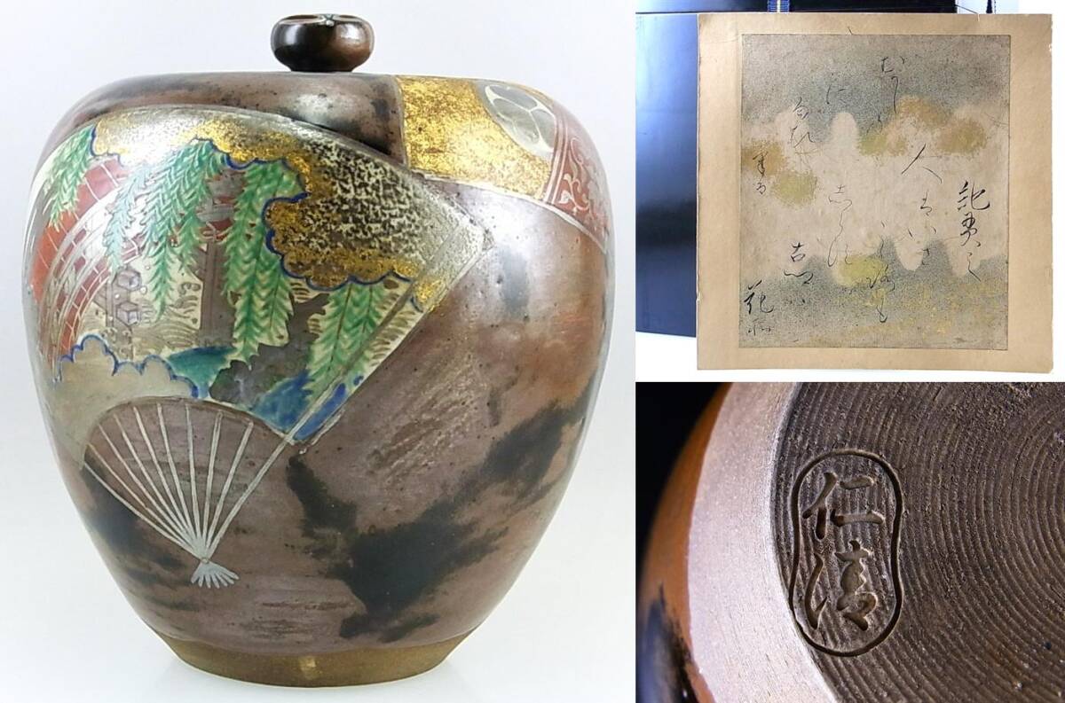> 江戸前期 野々村仁清作 鉄釉色絵銀彩 描き分け扇面図水指 和歌添え旧蔵箱付 10/6(月)終了