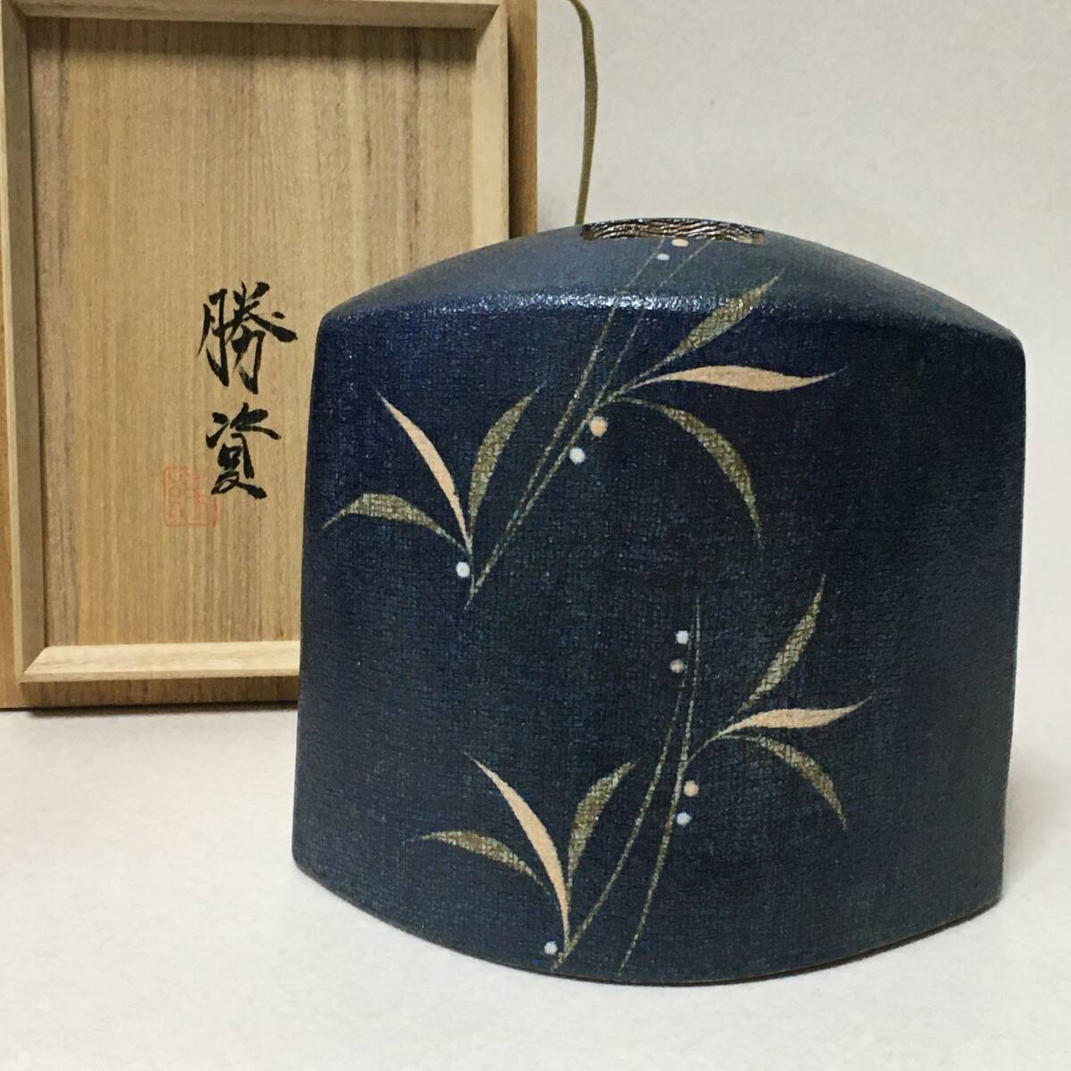 - E770 未使用 森勝資 彩瓷 草文 花生 扁壷 花瓶 置物 共箱 共布