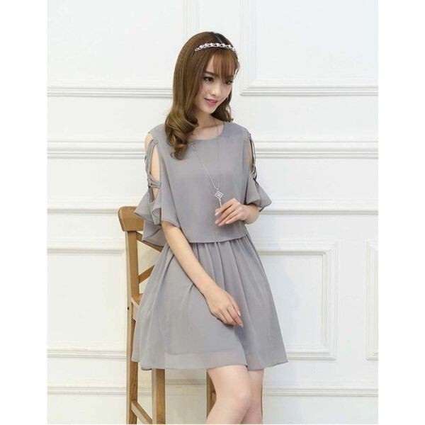 > ワンピース シフォン フレア ウェストゴム レディース 半袖 オープンショルダー ショート丈 無地 XXL グレー