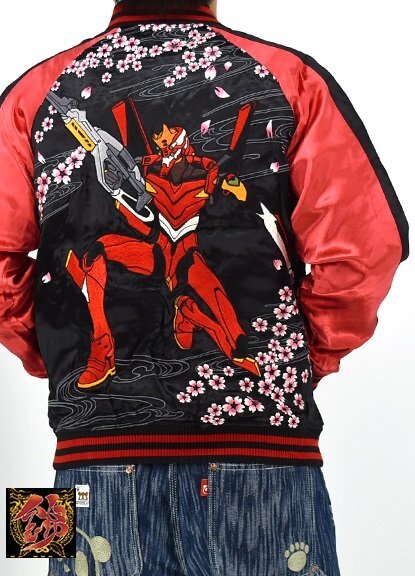 - EVANGELION×錦 桜流水2号機リバーシブルMA-1スカジャン◆錦 ブラック×レッド Mサイズ 595351 和柄 エヴァンゲリオン 刺繍