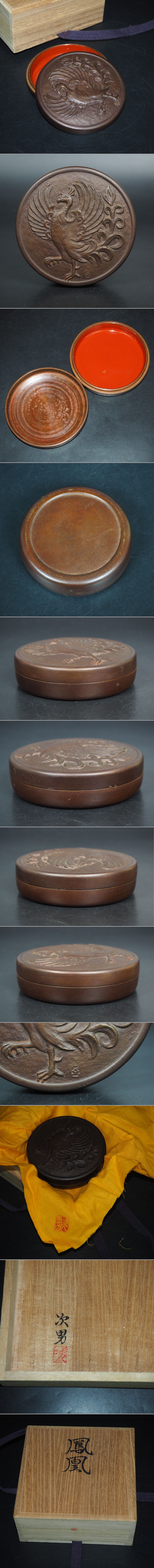 - 【金富士】値下げ中 『次男』作 銅製鳳凰文朱肉盒/印泥盒 共箱・黄布 検/茶托茶壺古錫玉川堂高岡佐渡銅器龍文堂亀文堂中国古玩