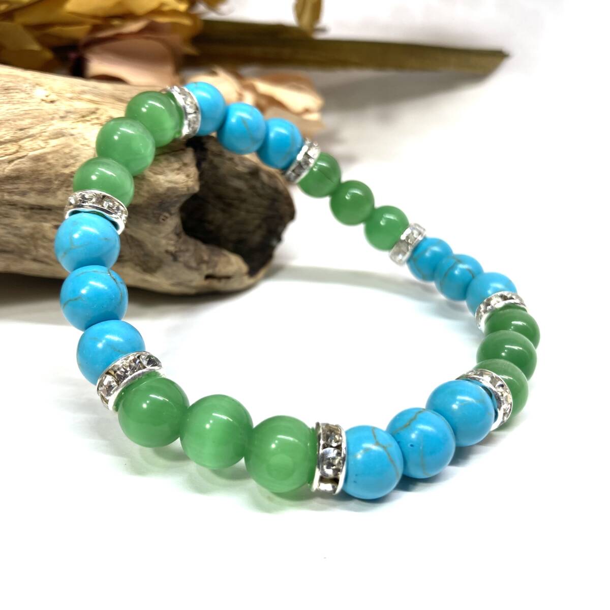 - ターコイズ&キャッツアイ(グリーン)パワーストーン ブレスレット(シルバー)メンズ レディース 男性 女性 開運 数珠 お守り