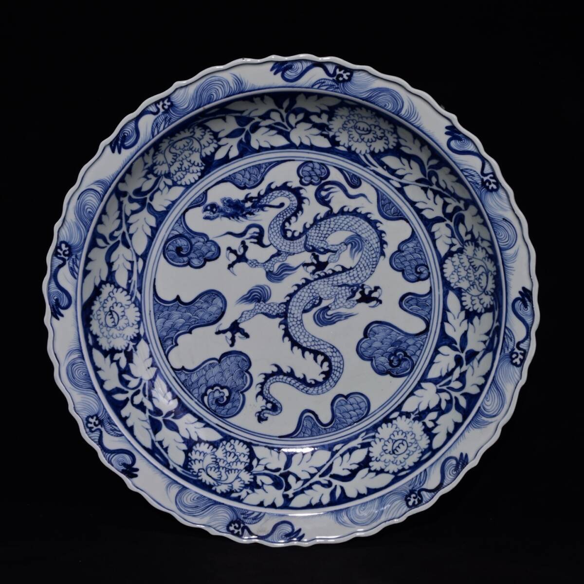 - 9~QN9220 中国磁器 陶芸 磁器『元青花刻乾隆御題竜紋賞盤』施釉陶 古代工芸品 陶芸 精美彫 置物 收藏品