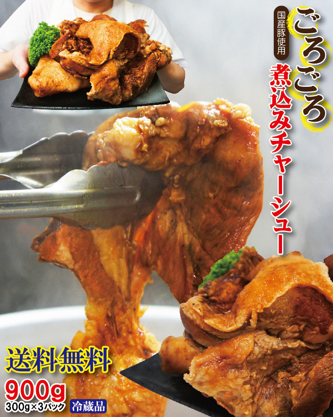 > 送料無料 国産豚肉ごろゴロ不揃い煮込み焼豚チャーシュー専用タレ付900g 300g×3パック 2セット以上落札でおまけ付