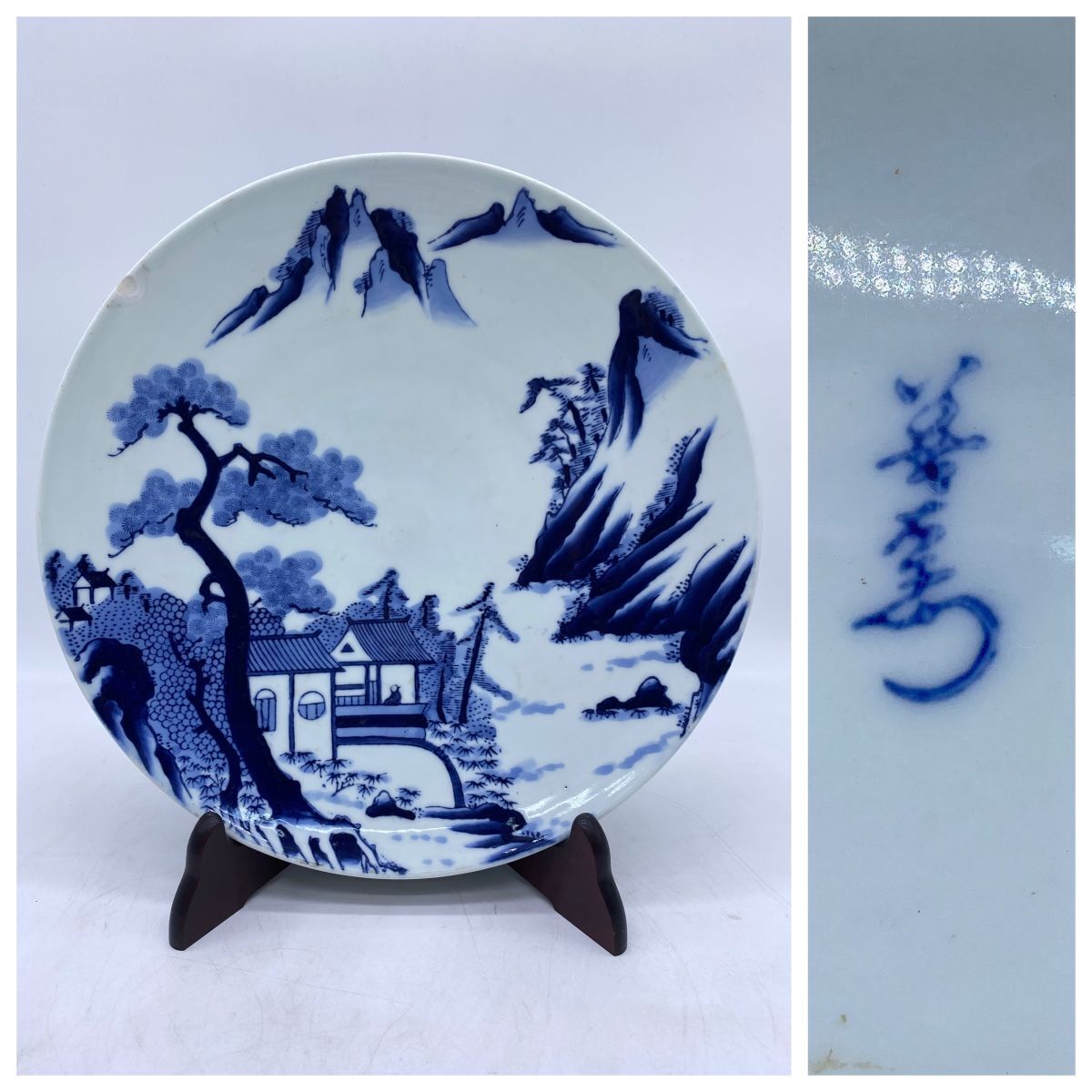 - 染付 山水図 大皿 在銘 飾皿 中国美術 唐物 陶器 陶芸 直径32cm 焼物 皿(13356)