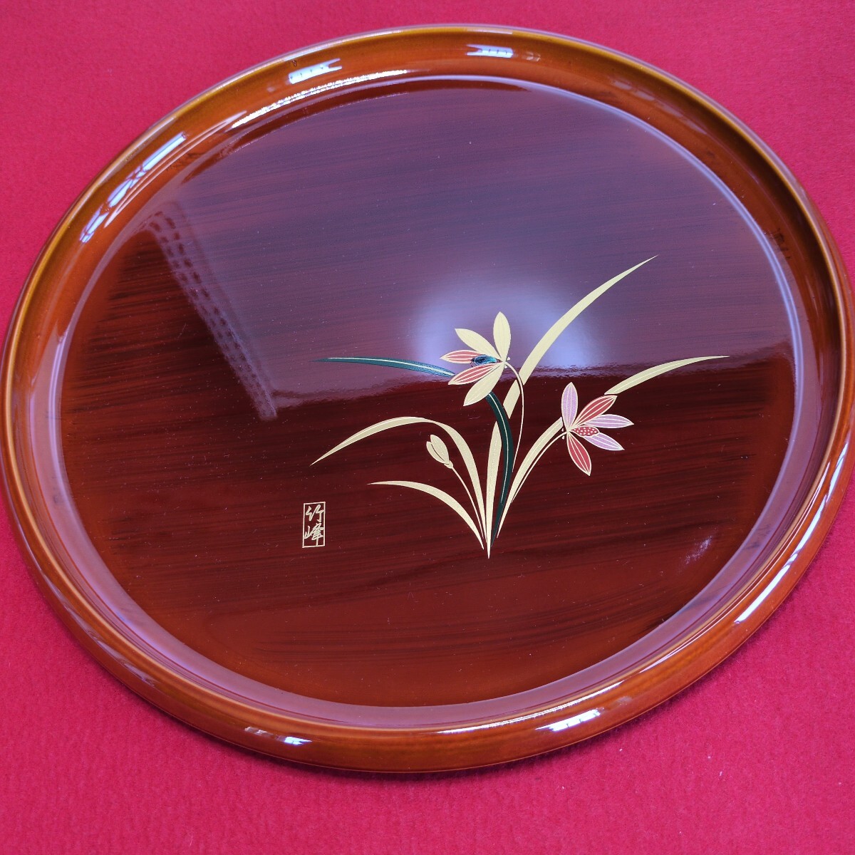 - 2510-07 春慶塗り 「ラン」 丸盆(約30cm)会津塗 木製 茶道具 煎茶盆 木製漆器 当時物