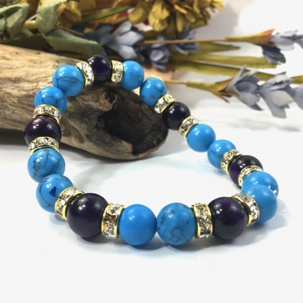 > パワーストーン ターコイズ×パープルタイガーアイ ブレスレット (ゴールド) 10mm メンズ・レディース 成功 繁栄 安全