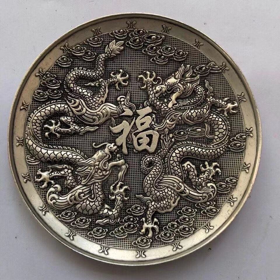 - 極美品 彫刻 福字双龍 銅鍍銀 真鍮製 純銅 お皿 福 手作り 10cm 工芸品 鑑賞 置物 仏具 観賞 ZH1788