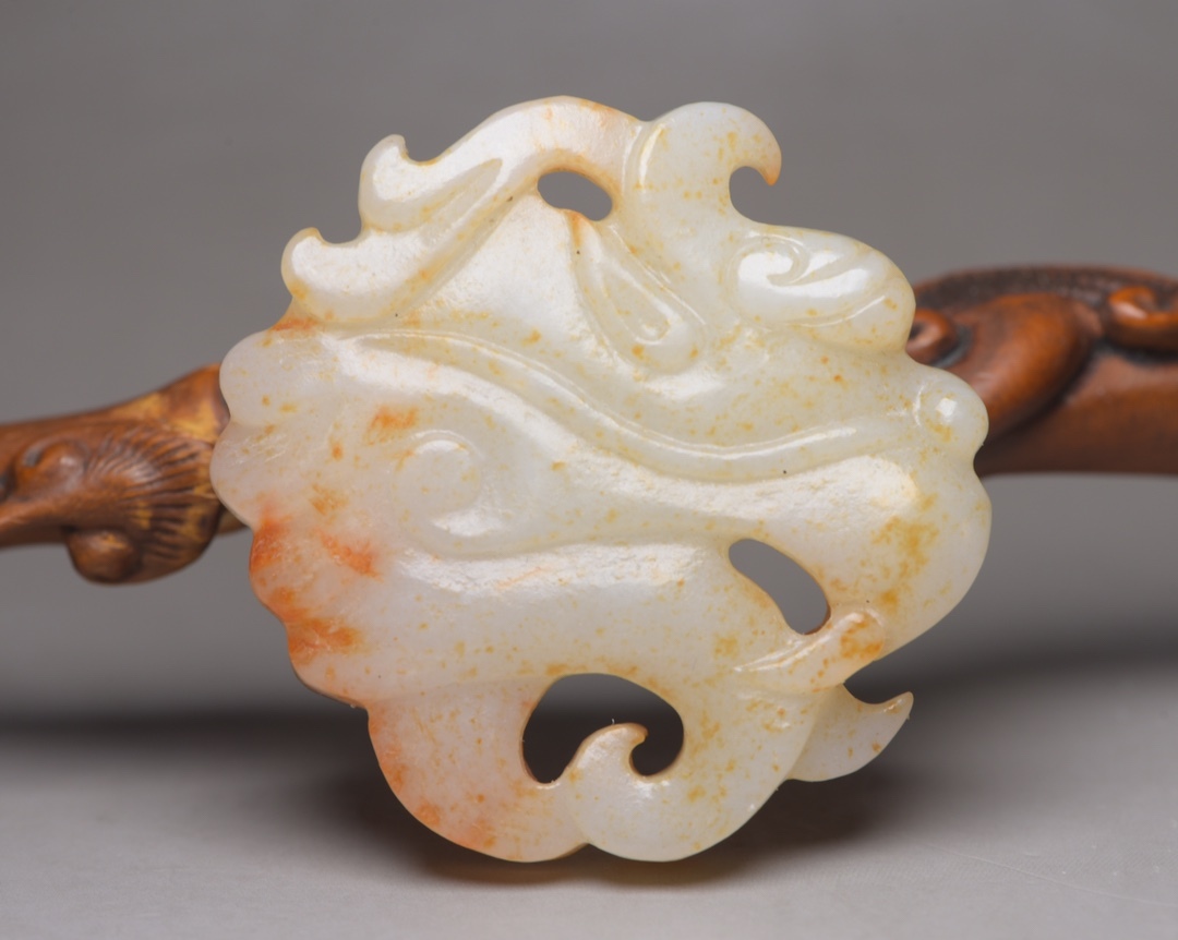 > 『館蔵珍品 和田玉製 細密彫 紅沁 龍首玉璧 置物 賞物』文房具 書道品 貴重物品 収蔵品 中国古美術 時代物 古董品