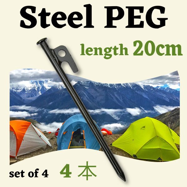 - スチールペグ ペグ スチール製 4本 20cm 高強度 引抜穴付きペグ テント タープ 設営 キャンプ DIY BBQ 野外フェス バーベキュー アウトドア