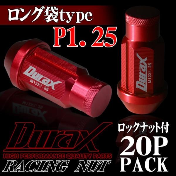 > ホイールナット DURAX製 ロックナット ロング袋ナット 50mm レーシングナット 20個 赤 レッド P1.25 長袋型 日産 スズキ 125RLFR