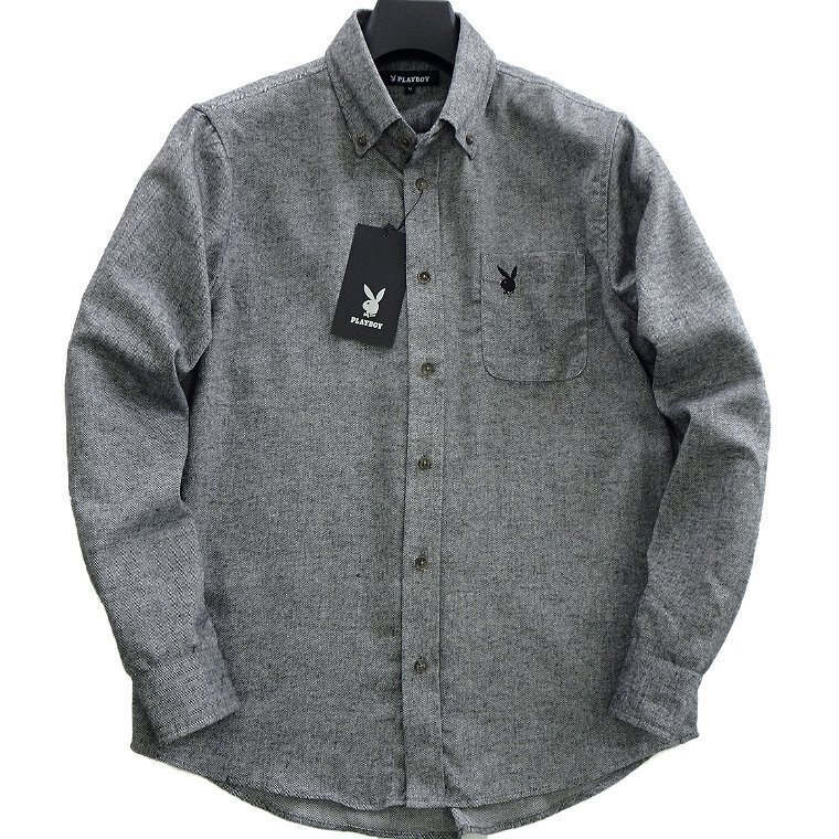 - 新品 プレイボーイ 秋冬 ヘリンボーン ビエラ シャツ M 灰【44003_398_M】 PLAYBOY メンズ 長袖 フランネル ネルシャツ ボタンダウン