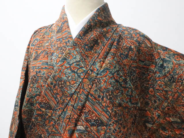 - 《京都一輝堂》【着物】小紋 唐花・更紗文 身丈約157.5cm 裄丈約63cm 25z03-1495