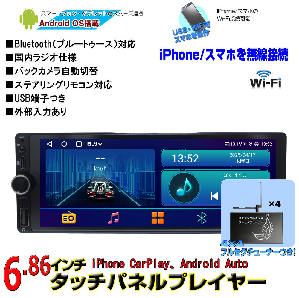 - 1DIN6.86インチタッチパネルプレイヤー+地デジ4x4フルセグチューナーセットAndroid搭載CarPlayAndroidautoラジオUSBBluetooth