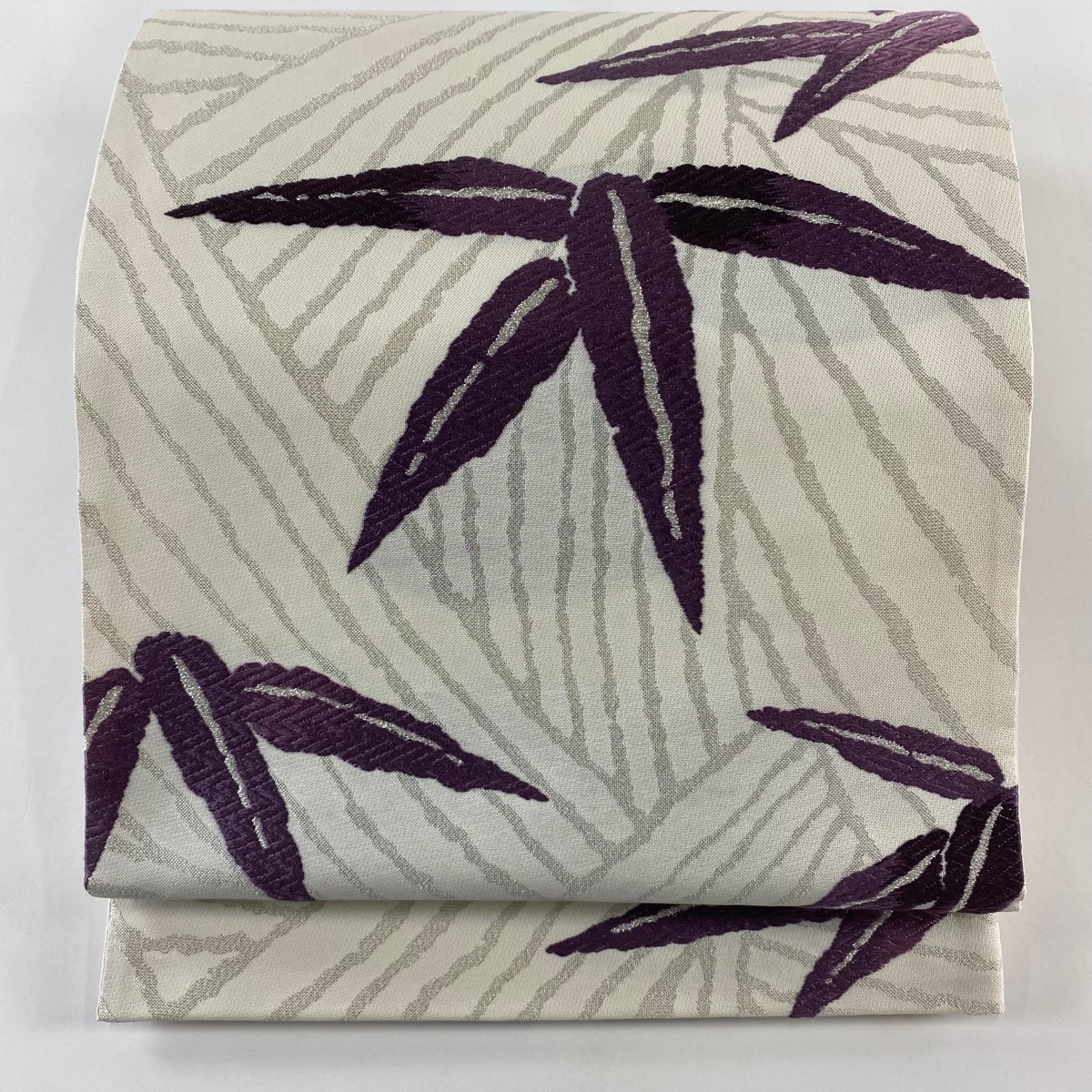- 【美品】 袋帯 秀品 葉 幾何学模様 刺繍 銀糸 灰白 六通 正絹 【中古】