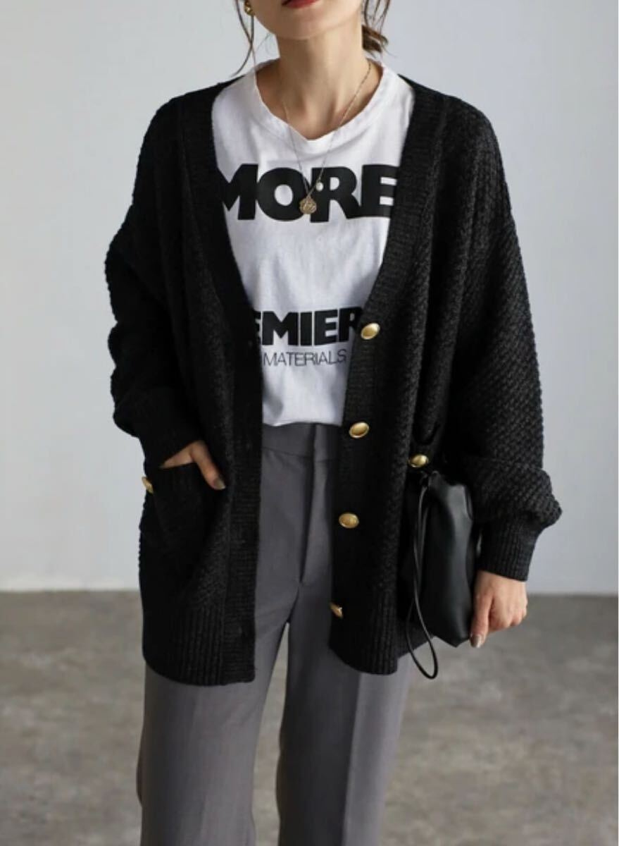 - 新品 タグ付き 金ボタン ツイードライク ニットカーディガン フリーサイズ ブラック Bonjour Sagan