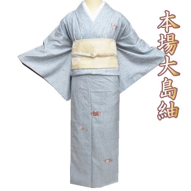 > 本場 大島紬 着物 中古 正絹 袷 セミフォーマル 杢目絞り 刺繍 反端付き 朧花色 多色 身丈156cm 裄63cm M きもの北條 A1278-3