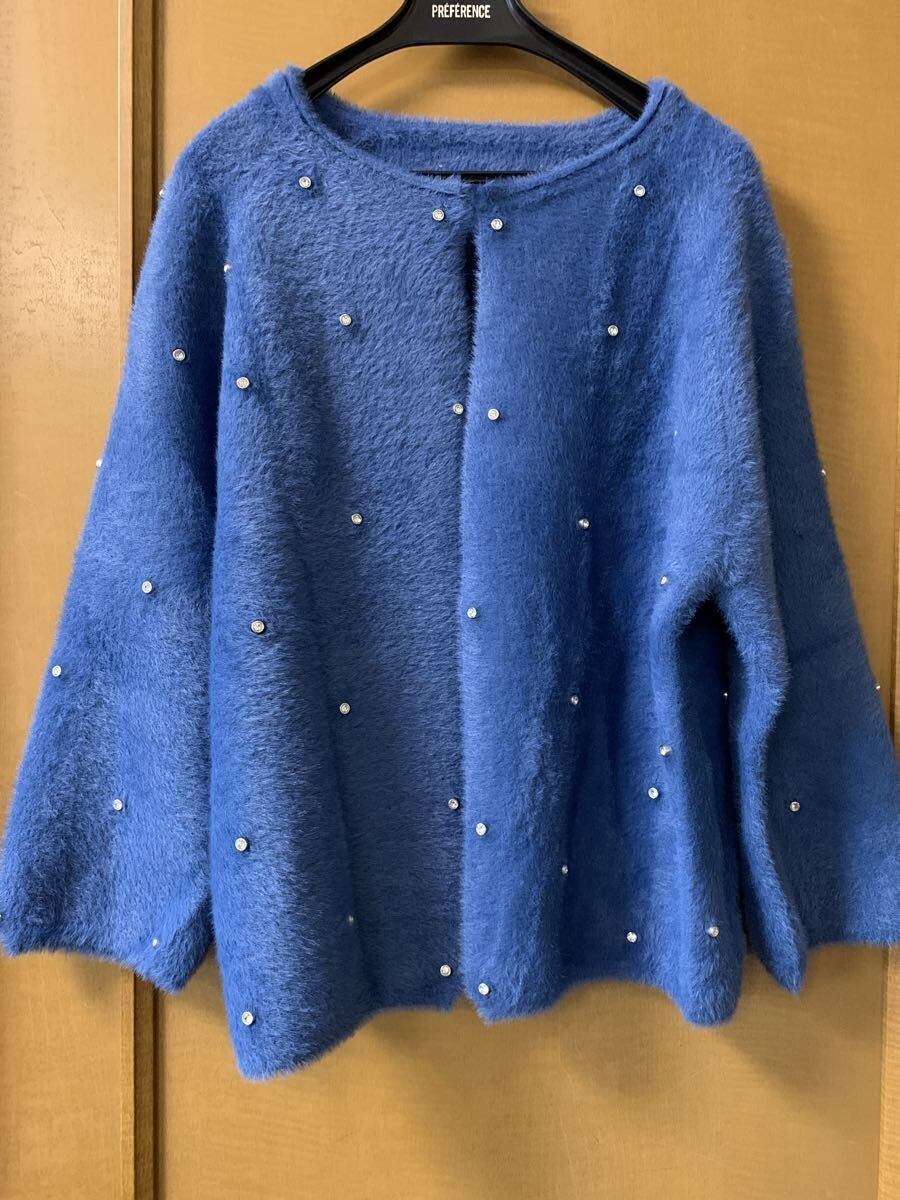 - カーディガン ビジュー付きジャケット 七分袖 ブルー 身幅52cm 着丈59cm