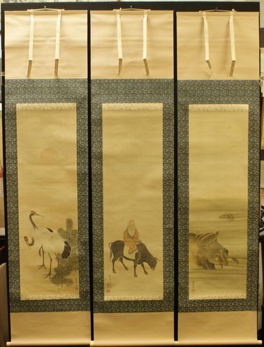 > ・作者名:円山 応挙・画題:「鶴・牛人図・亀」・技法:掛軸(三幅一対)直筆〈244)(A1-HIO-R4-6-22-385.)