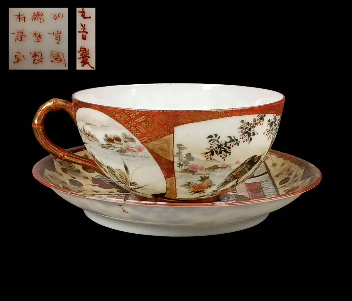 > 【偲】明治期 九谷製 加賀國 綿埜製 カップ&ソーサー 赤絵 花鳥人物紋 細密絵付け 薄手 高さ約5.7㌢ c-246