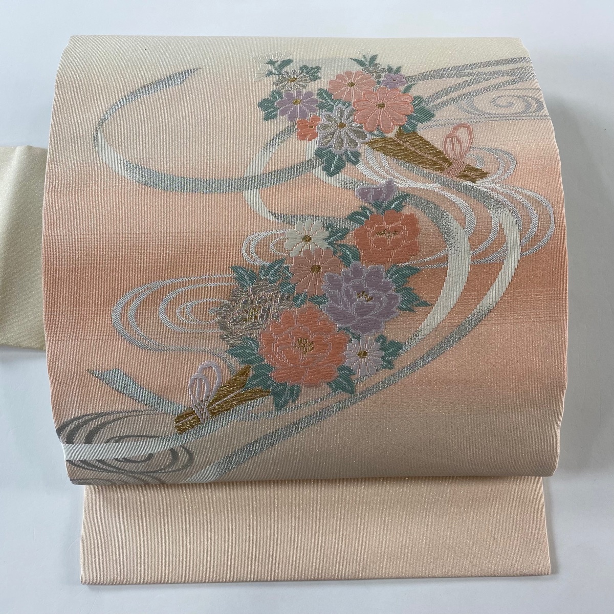 - 【美品】 名古屋帯 優品 牡丹 流水 金銀糸 箔 ピンク 正絹 【中古】