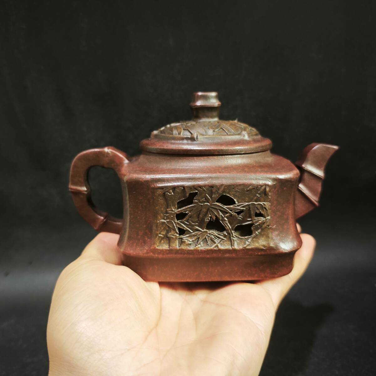 - 【超珍館蔵】紫砂壺 四方鏤空壺 顧景舟款 古紅料 茶具 茶道品 置物 賞物 古賞物 古董品 古美術品 時代物 旧家蔵出 稀少珍蔵品