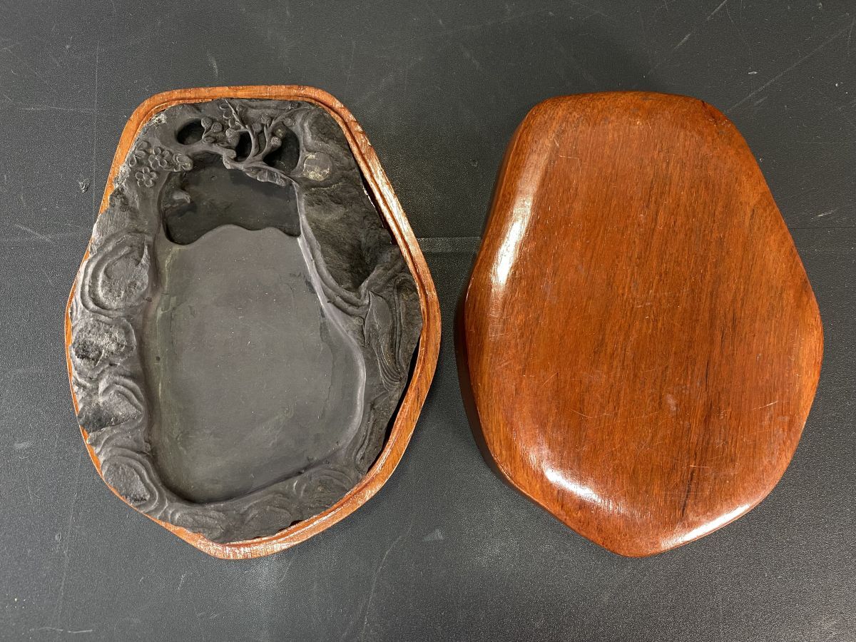 - 端渓硯 花鳥紋 氷紋 合木箱 歙州硯/文房四宝/中国古玩/中国美術/書道具/古美術/骨董品 19x 15x 5.7cm 硯(13456)