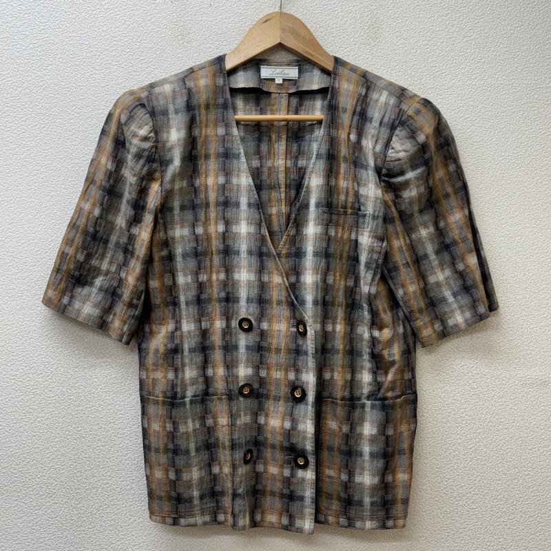 - レリアン 日本製 コットン リネン チェック柄 ノーカラー ダブル 半袖 ジャケット 9号