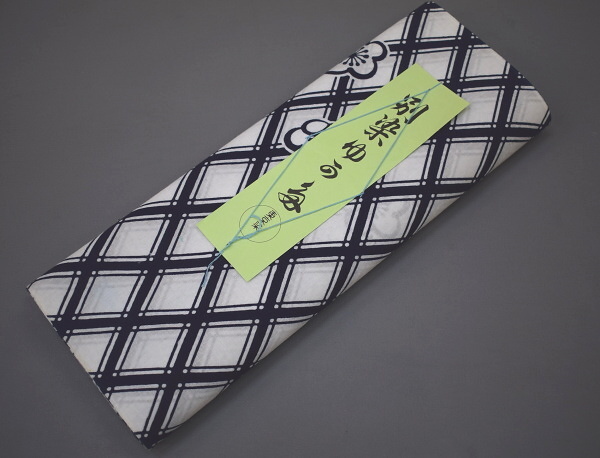 - A39-14【凛々】即決 新古品 本染 ゆかた反物 白 斜め格子 梅 未仕立て品