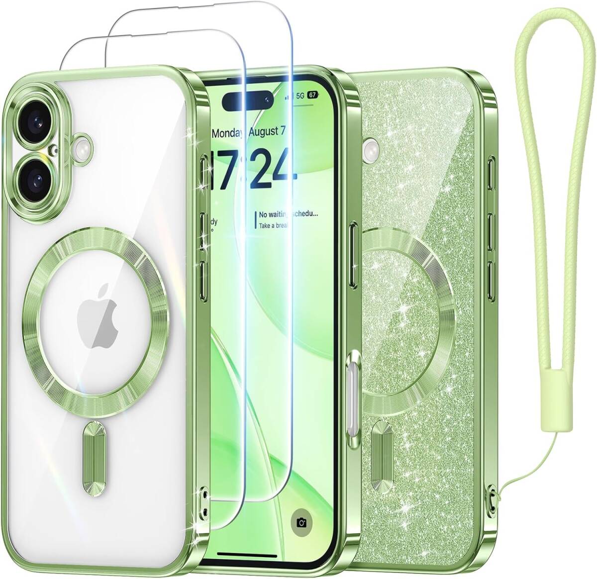 > Meifigno ケース iPhone 16 6.1インチ用 [MagSafe対応] [スクリーンプロテクター2枚] [グリッターカード&リストストラップ] グリーン